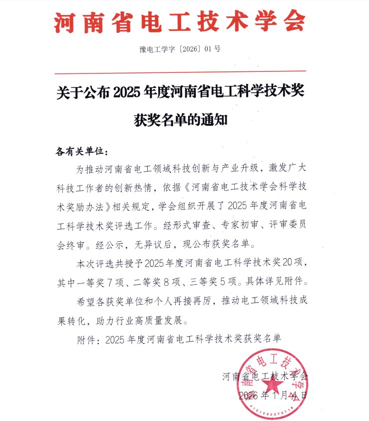 小编从河南省电工技术学会发布的2025年度河南省电工科学技术奖信息获悉,为推动河南省电工领域科技创新与产业升级,激发广大科技工作者的创新热情,依据《河南省电工技术学会科学技术奖励办法》相关规定,学会组织开展了2025 年度河南省电工科学技术奖评选工作。经形式审查、专家初审、评审委员会终审。 本次评选共授予2025年度河南省电工科学技术奖20项其中一等奖7项、二等奖8项、三等奖5项。 河南杏鑫娱乐电缆集团有限公司获得二等奖。 项目为阻燃 B1 级耐火电缆研发及产业化。 杏鑫娱乐始建于1954年,中国机械制造500强,是一家非常有实力的电线杏鑫娱乐,产品涵盖电线电缆型号几十万种,包括但不限于KVVP屏蔽控制电缆,ZR-YJV22铠装电力电缆,ZR-BVR,RVS,RVV聚氯乙烯绝缘护套家用布电线,YJLHV铝合金电缆,BTTZ矿用电缆,架空电缆,防火特种电缆等产品。所有产品都符合国家标准生产,质量有保障,买电缆,选杏鑫娱乐。